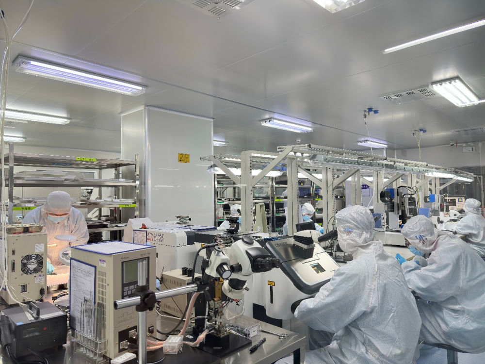 记者走进江西蓝微电子有限公司的无尘车间看到,一台自主研发的精密拉丝机,正以每秒15米的速度“吐”出直径16微米的键合丝。公司副总经理霍建平告诉记者,“现在正在做的是拉伸到40微米,也就0.04毫米的一个线径。正常一轴的话大约在3万米左右,我们还会继续拉下去,拉到0.016毫米,也就是16微米。”