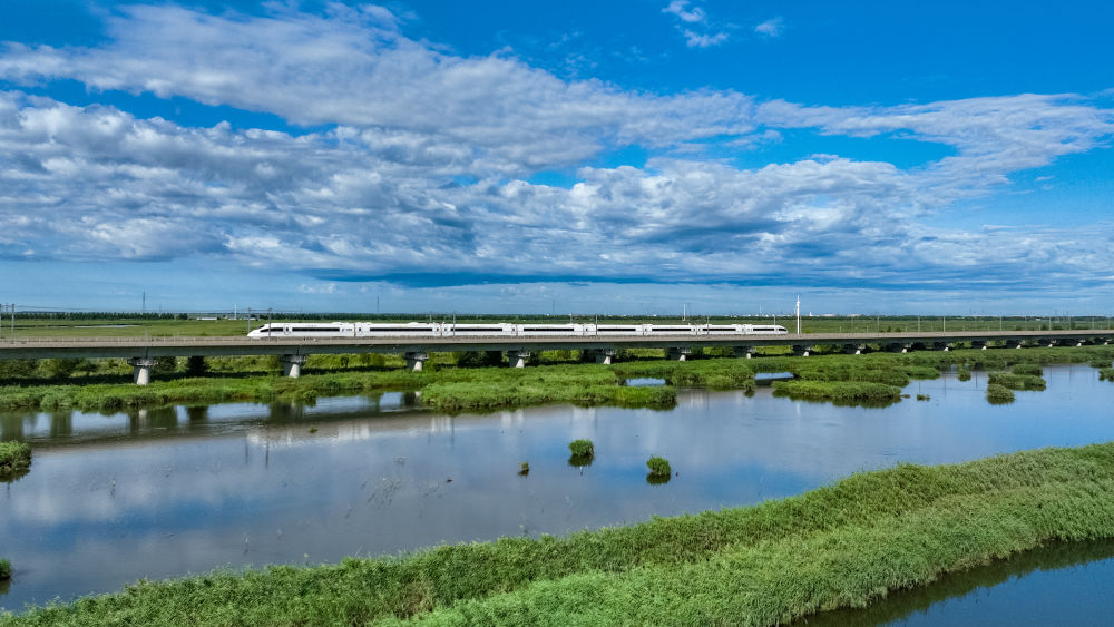 8月17日,一列动车组列车正行驶在哈齐高铁线上(无人机照片)。新华社发(原勇摄)